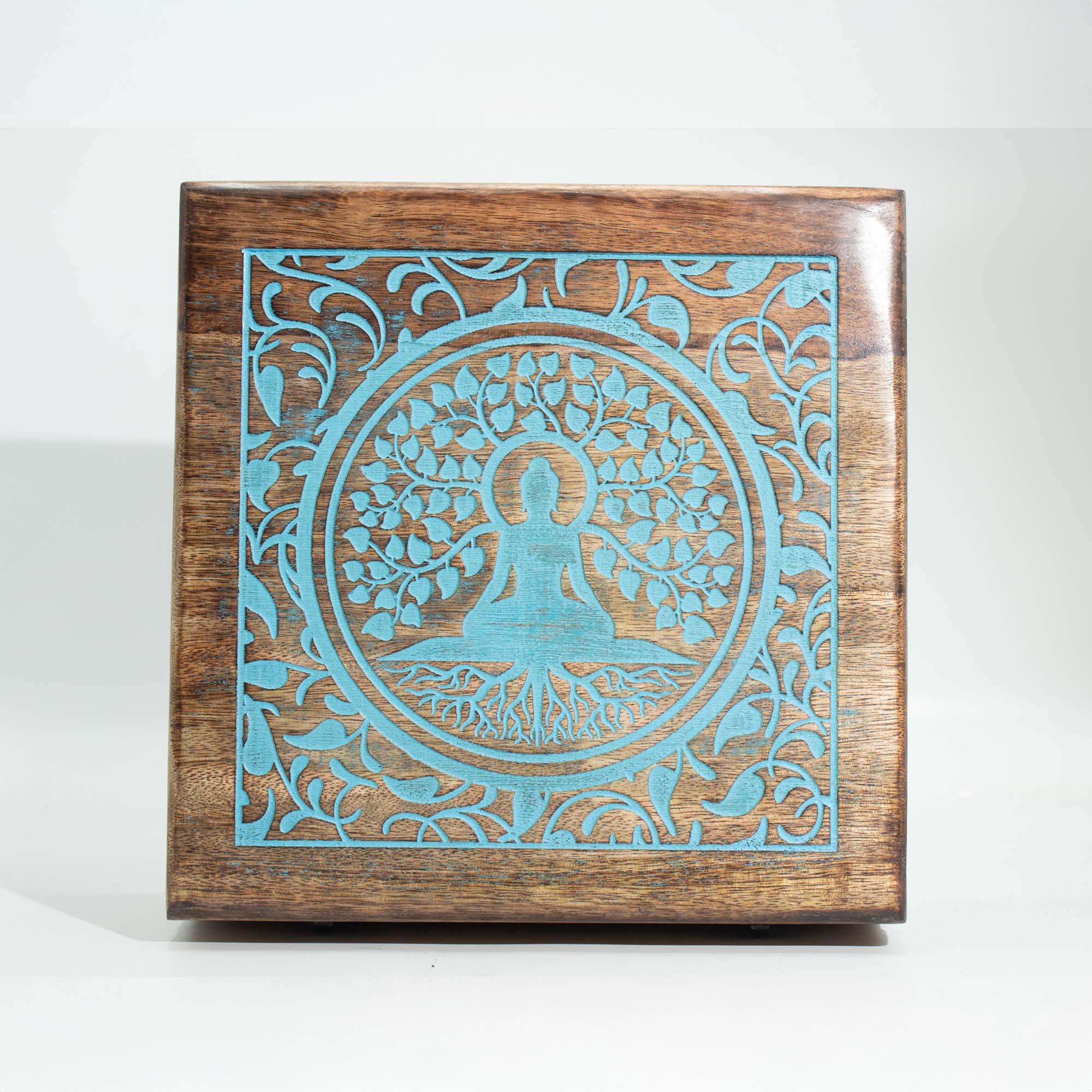 To wyjątkowy dekoracyjny dodatek który łączy w sobie funkcjonalność z głęboką symboliką, idealnie wpisując się w gusta klientów poszukujących przedmiotów z duszą. Ekstra duże pudełko wykonane z wysokiej jakości drewna mango przyciąga wzrok precyzyjnym grawerem przedstawiającym Buddę pod drzewem Bodhi, co nadaje mu aurę spokoju i harmonii. Wyrazisty, turkusowy kolor wypełniający zdobienia efektownie kontrastuje z naturalnym, ciepłym odcieniem drewna, tworząc produkt o dużej wartości dekoracyjnej.