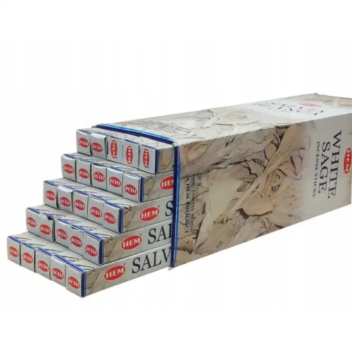 Aukcja dotyczy 1 zbiorczego opakowania zawierającego 25 pudełek po 8 patyczków. Łącznie 200 patyczków kadzideł HEM White Sage.