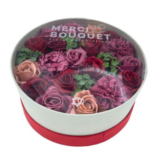 Okrągły Mydlany Flower Box - Vintage to hołd dla piękna minionych czasów, którym teraz można cieszyć się w postaci trwałej i pięknie wykonanej kompozycji kwiatowej.