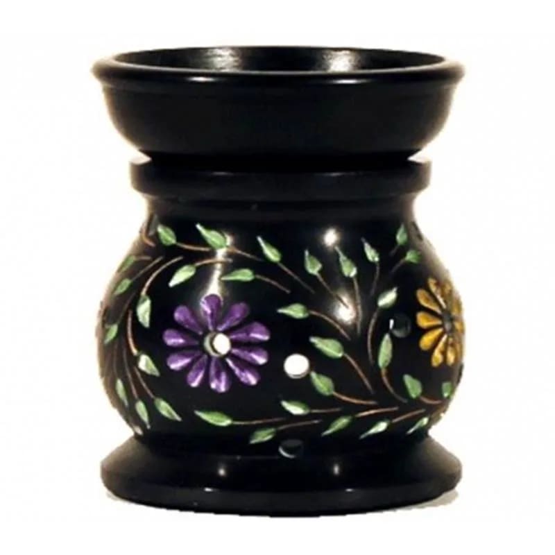 Urocza aromatyczna lampa wykonana z czarnego polerowanego steatytu, ciężkiej jakości. Pojemnik na olej można wyjąć, dzięki czemu można go łatwo wyczyścić.Przez drobno pokrojone kwiaty lotosu po wszystkich 4 stronach podstawy można zobaczyć mały płomień świecy w środku.