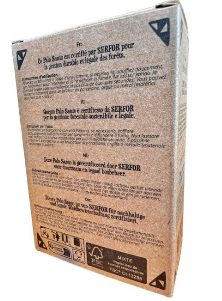 Oferowane przez nas Palo Santo pochodzi z legalnych certyfikowanych źródeł. Drewno pozyskiwane jest wyłącznie z naturalnie obumarłych drzew zgodnie z zasadami ochrony środowiska. Produkt posiada certyfikat SERFOR czyli peruwiańskiego urzędu nadzorującego legalność i zrównoważone pozyskiwanie Palo Santo.