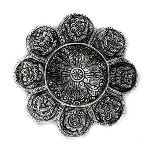 Podstawka pod Kadzidełka z Polerowanego Aluminium - Tybetańskie Symbole wykonana jest z polerowanego aluminium, o średnicy 12 cm, jest solidna, łatwa w czyszczeniu i odporna na korozję.