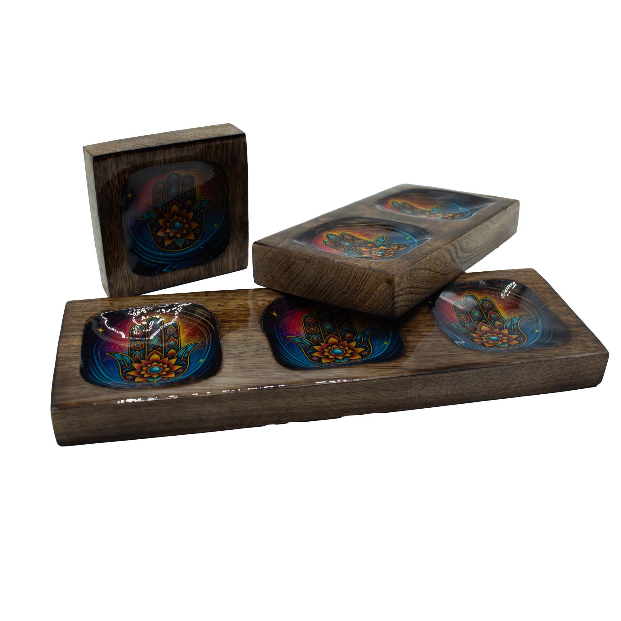 Ten unikatowy zestaw tac wykonanych z litego drewna mango to doskonała propozycja dla detalistów celujących w rynek akcesoriów dekoracyjnych z segmentu wellness i ezoteryki. Każdy element zestawu posiada wgłębienie wykończone lśniącą emalią z niezwykle barwnym, psychodelicznym motywem dłoni Hamsy, co tworzy intrygujący kontrast z surową fakturą drewna. Wykorzystanie symbolu ochronnego w nowoczesnej, nasyconej kolorystycznie oprawie sprawia, że produkt przyciąga wzrok i stanowi mocny punkt ekspozycji sklepowej.