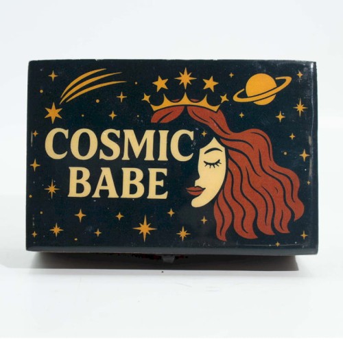 Największą uwagę przyciąga lśniące, emaliowane wieczko z odważnym hasłem „Cosmic Babe”. Głęboka czerń tła w połączeniu ze złotymi akcentami i ciepłym odcieniem drewna tworzy kompozycję pełną elegancji, która natychmiast staje się centralnym punktem każdej toaletki czy półki ekspozycyjnej.